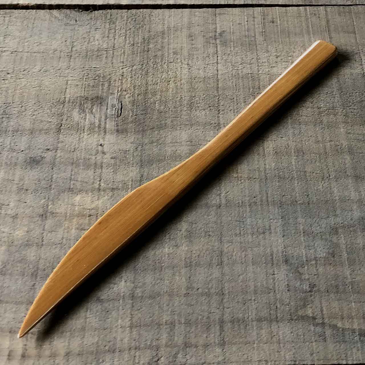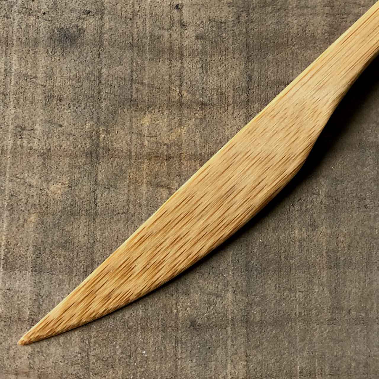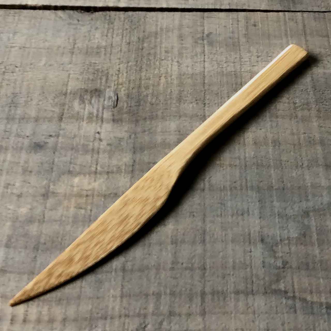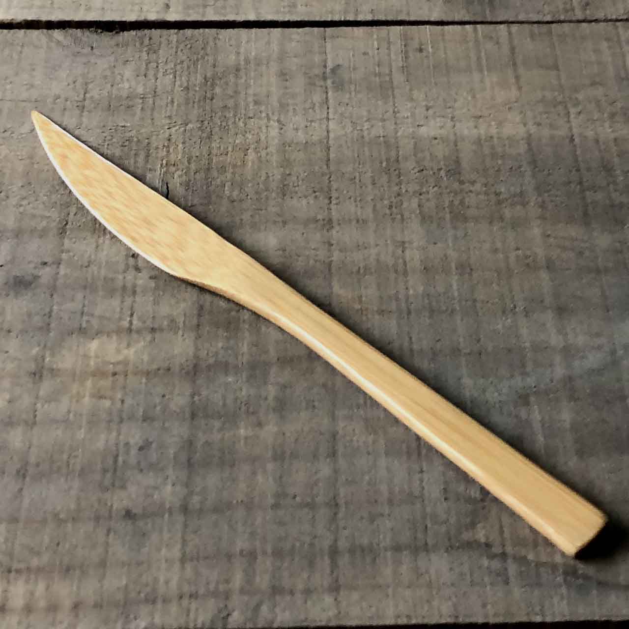 竹のお料理ナイフ。金属製ナイフと違い、非常に軽く食事の際、疲れにくく、美味しく料理を頂けます。また手に取って握ると手になじみ易く出来ています。毎日の食卓を楽しくさせてくれそうです。表面は薄くウレタン塗装を施を施しています。