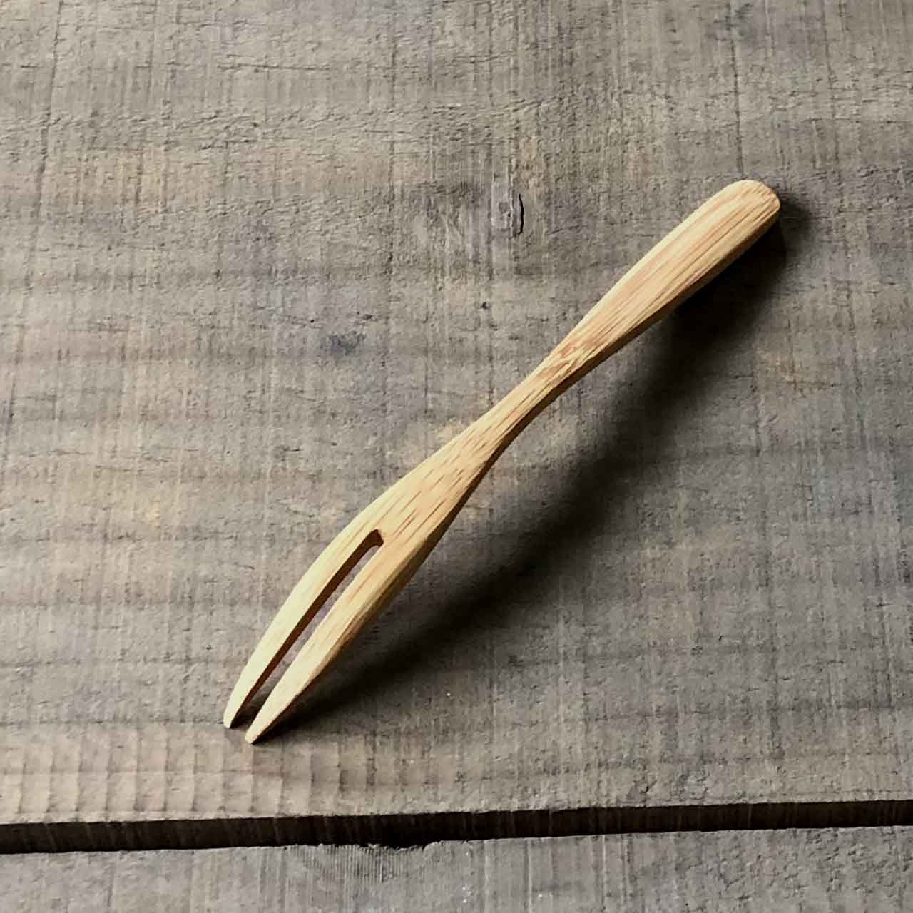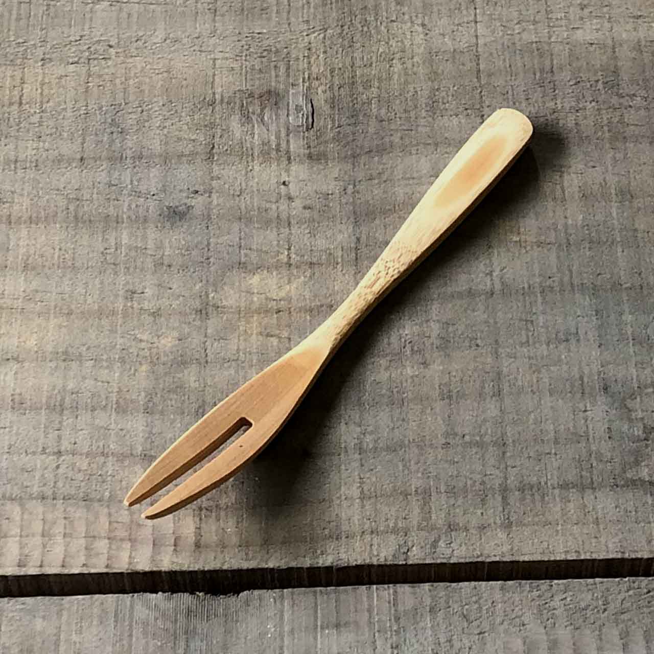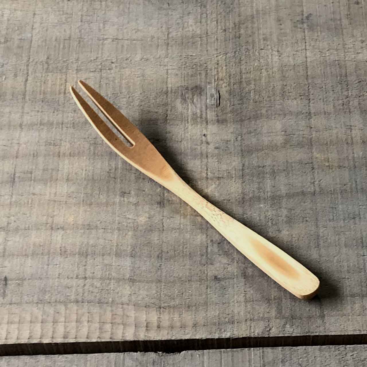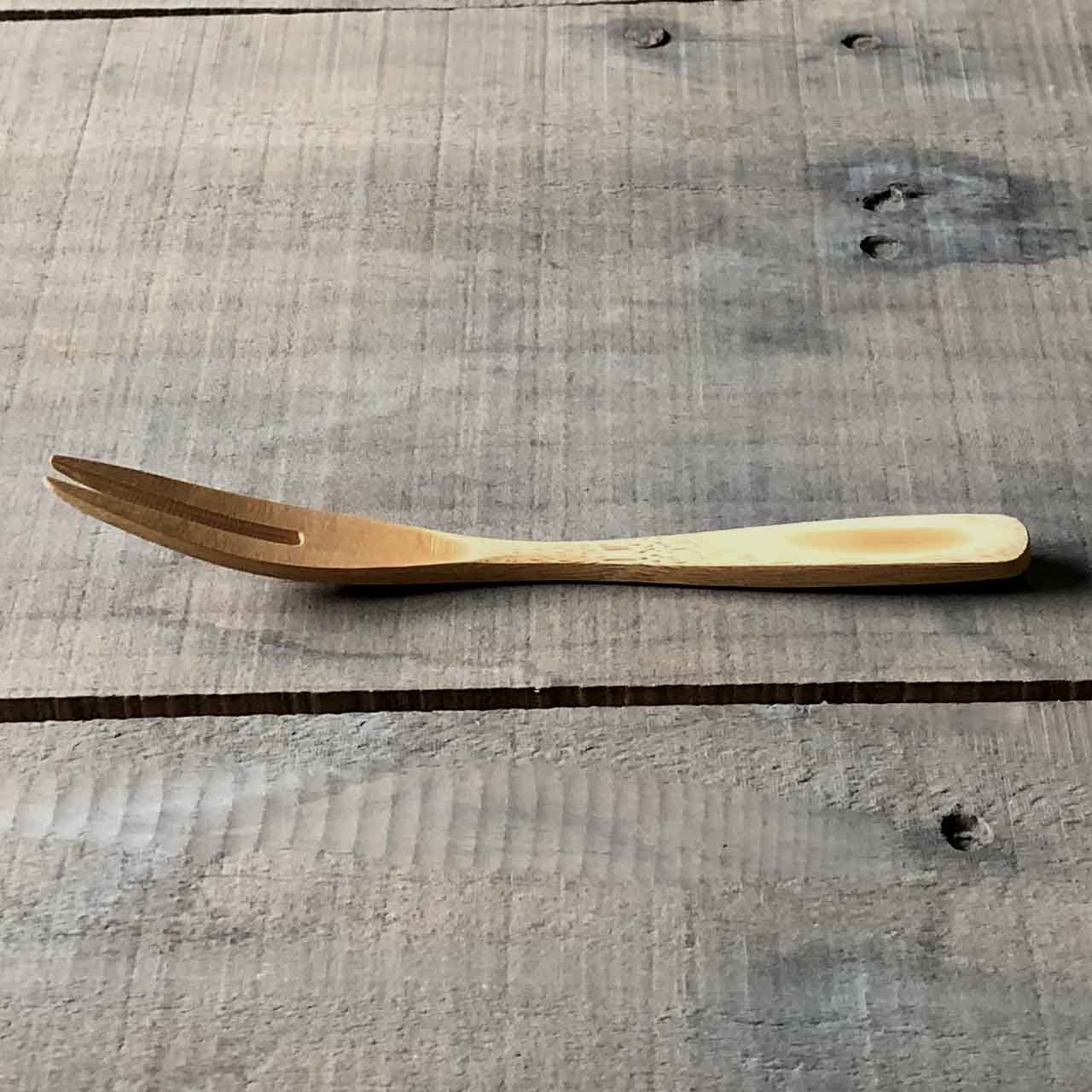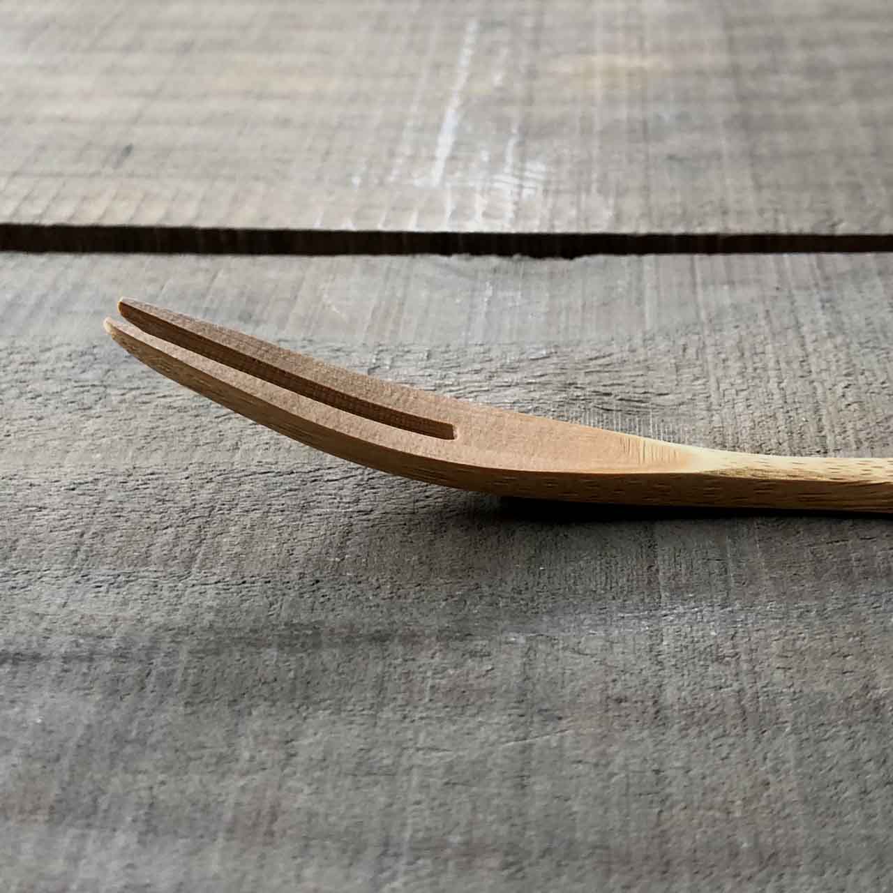 持ちやすい曲線デザインの竹フォーク。フォークの優しい口当たりや曲線美しさが魅力です。持ち手は竹の特性の弾力を生かし、緩やかな曲線を入れることにより、直接食卓に置いてもフォーク先端部が直接食卓に着くことがありません。表面は蜜ろう加工を施しておりフォークを持った時非常に軽く、肌触りも最高なフォークです。
